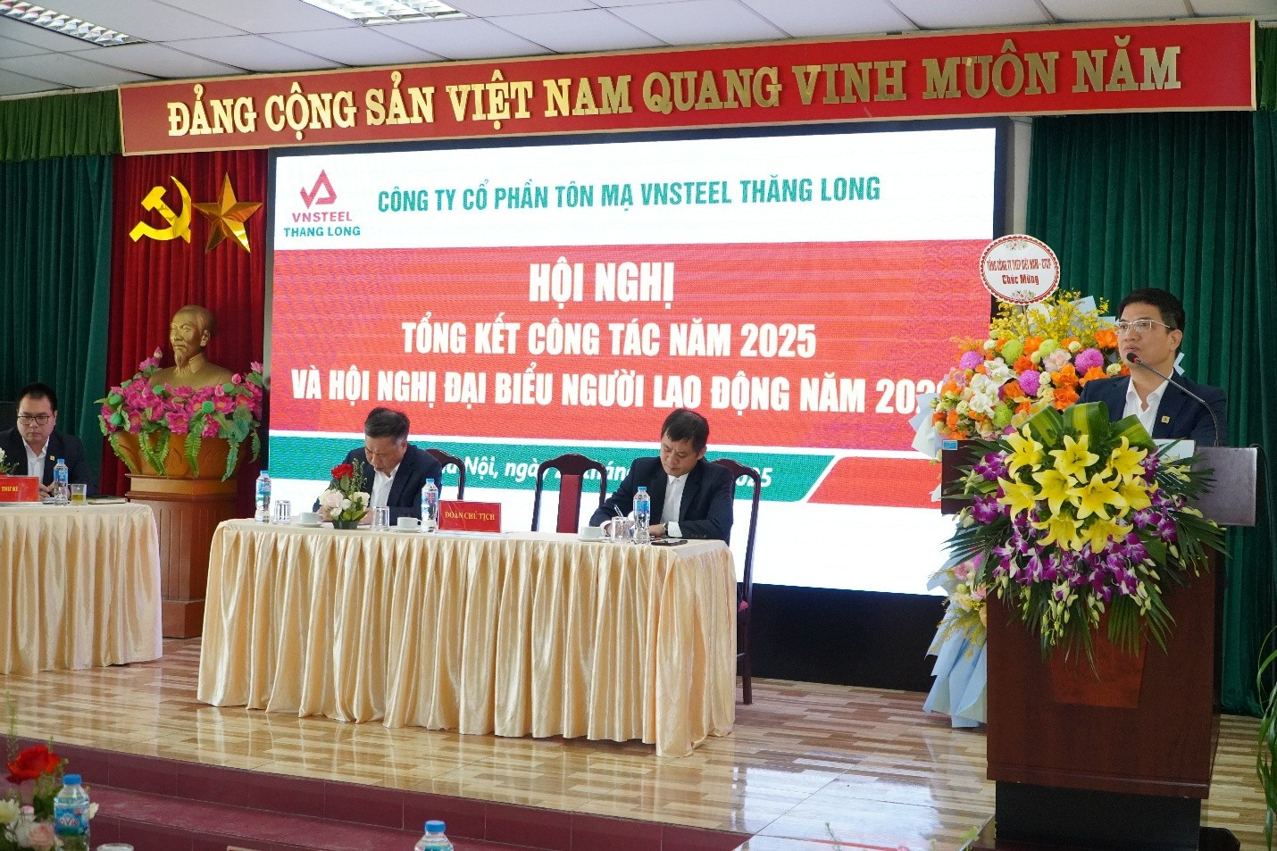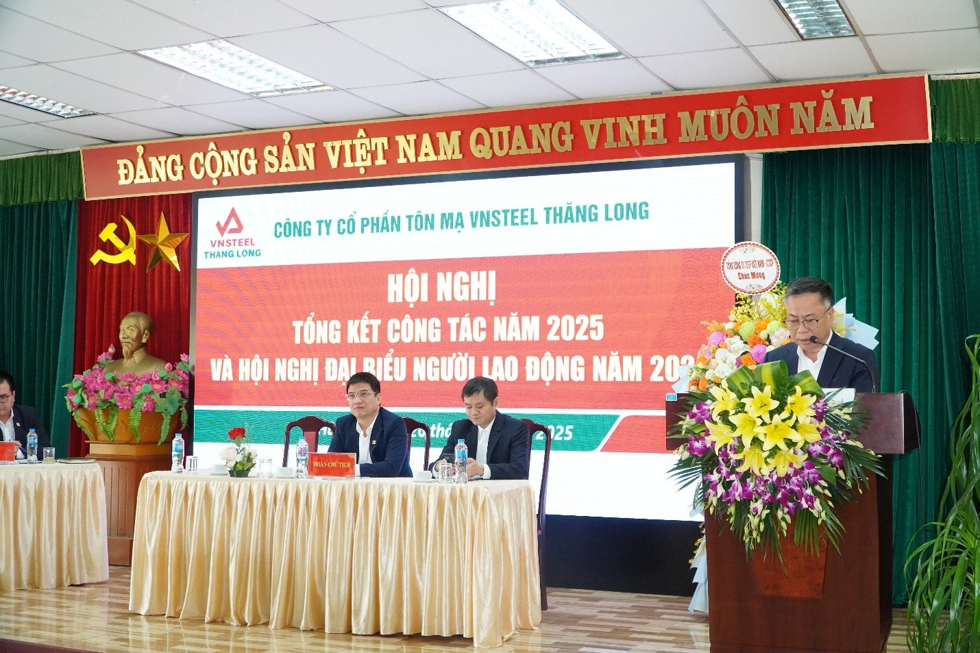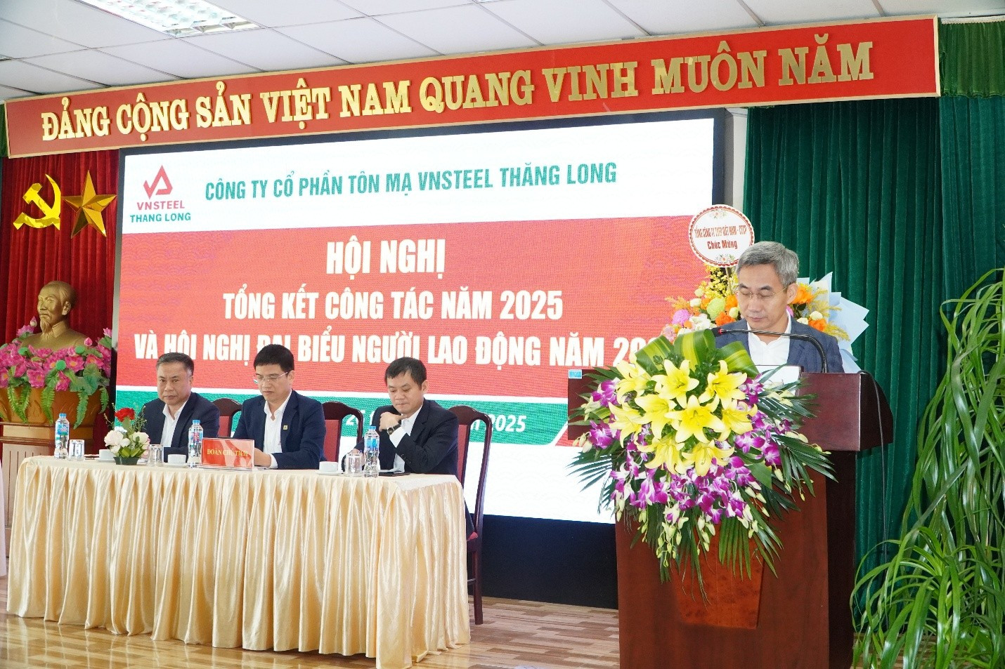 Phát biểu tổng kết Hội nghị, đồng chí Vũ Duy Huynh - Bí thư Đảng ủy, Tổng Giám đốc Công ty nhấn mạnh: Năm 2025, ngành thép nói chung và doanh nghiệp tôn mạ nói riêng hoạt động trong điều kiện có nhiều khó khăn, thuận lợi đan xen. Tôn Vnsteel Thăng Long đã tận dụng tốt các cơ hội trong năm 2025, cùng với sự quan tâm của lãnh đạo Tổng công ty Thép Việt Nam-CTCP, sự chỉ đạo của Đảng ủy, Hội đồng quản trị Công ty và sự đoàn kết, cố gắng của toàn thể CBCNV người lao động, Công ty cổ phần Tôn mạ Vnsteel Thăng Long đã hoàn thành xuất sắc, vượt xa kế hoạch sản xuất kinh doanh năm 2025, đảm bảo ổn định việc làm, nâng cao chế độ phúc lợi và thu nhập cho người lao động.