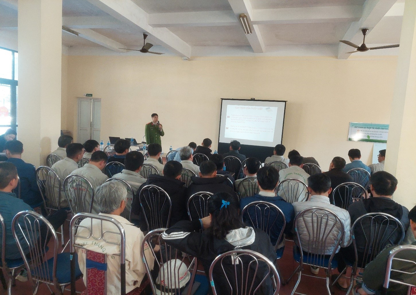 Thượng uý Tạ Trung Kiên - Cán bộ phòng PCCC&CNCH, Công an TP. Hà Nội phổ biến kiến thức pháp luật về PCCC tại khóa huấn luyện